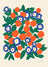 Colorful artwork featuring a lively arrangement of oranges and blue flowers surrounded by lush green leaves, creating a cheerful and refreshing composition.