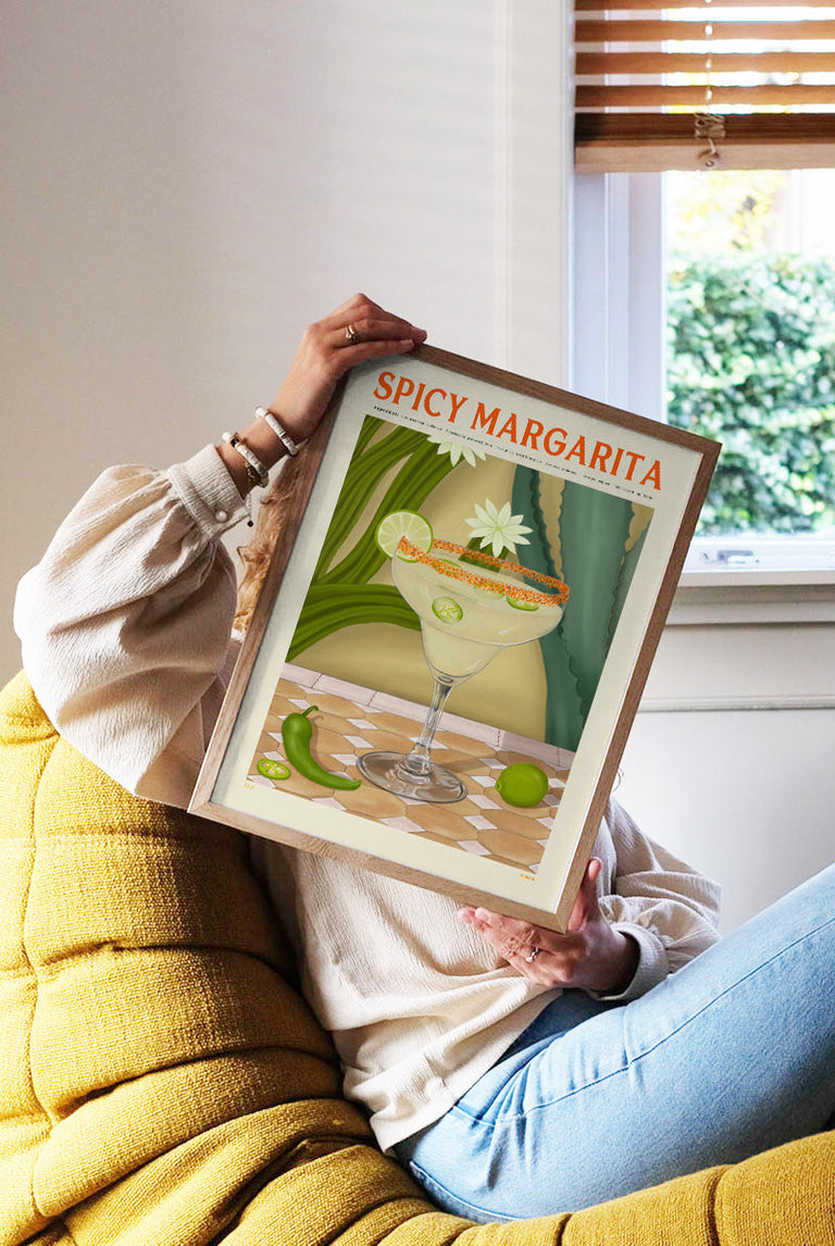 Vibrant poster showcasing a refreshing a Spicy Margarita, beautifully illustrated with ingredients. Its bright colors and cheerful vibe make it a delightful addition to any kitchen or bar!