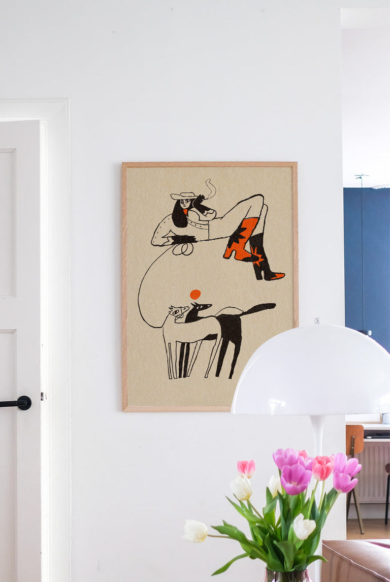 A confident woman lounging with a lasso and sporting vibrant red boots! Set against a warm beige background with playful horses and a bold sun, radiating fun!